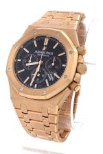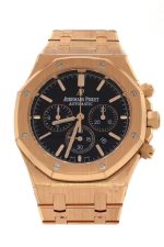 18kt pink gold case with a 18kt pink gold bracelet. Fixed bezel. Black dial with gold-tone hands and index hour markers. Dial Type: Analog. Date display between 4 and 5 o’clock position. Chronograph – sub-dials displaying: three – 60 second, 30 minute and 12 hour. Automatic movement. Scratch resistant sapphire crystal. Screw Down crown. Case diameter: 41 mm. Case thickness: 10.80 mm. Round case shape. Water resistant at 50 meters / 165 feet. Functions: chronograph, date, hour, minute, second. Luxury watch style. Watch label: Swiss Made. Audemars Piguet Royal Oak Chronograph Black Dial Mens Watch 26320OROO1220OR01