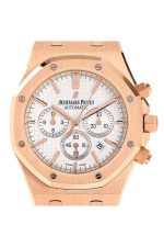 18kt pink gold case with a 18kt pink gold bracelet. Fixed bezel. Silver dial with gold-tone hands and index hour markers. Minute markers around the outer rim. Dial Type: Analog. Date display between 4 and 5 o’clock position. Chronograph – sub-dials displaying: three – 60 second, 30 minute and 12 hour. Automatic movement. Scratch resistant sapphire crystal. Screw Down crown. Case diameter: 41 mm. Case thickness: 10.80 mm. Round case shape. Water resistant at 50 meters / 165 feet. Functions: chronograph, date, hour, minute, second. Luxury watch style. Watch label: Swiss Made. Audemars Piguet Royal Oak Chronograph Silver Dial Automatic Mens Watch 26320OROO1220OR02