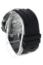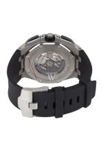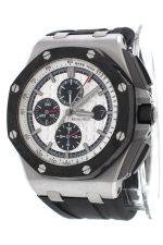 Stainless steel case with a black rubber strap. Fixed black ceramic bezel. Silver tone dial with silver-tone hands and index hour markers. Minute markers. Tachymeter markings around the outer rim. Dial Type: Analog. Luminescent hands and markers. Date display at the 3 o’clock position. Chronograph – three sub-dials displaying: 60 second, 30 minute and 12 hour. Automatic movement with a 50 hour power reserve. Scratch resistant sapphire crystal. Screw down crown. Skeleton case back. Case diameter: 44mm. Case thickness: 14.3 mm. Octaganol case shape. Tang clasp. Water resistant at 100 meters / 330 feet. Functions: chronograph, date, hour, minute, second. Luxury watch style. Watch label: Swiss Made. Audemars Piguet Royal Oak Offshore White mega Tapisserie Dial Black Rubber Strap Mens Watch 26400SO.OO.A002CA.01