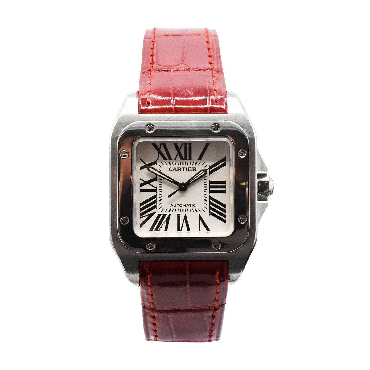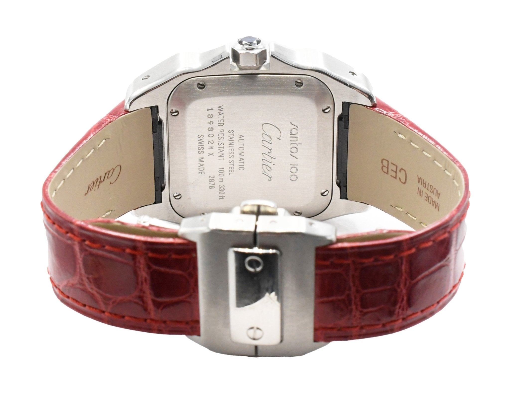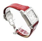 This pre-owned Santos 100 Watch is a unisex piece, perfect for both men and women who appreciate fine craftsmanship and exquisite design. The 33mm Stainless Steel case adds a touch of masculinity, while the red alligator leather strap brings a bold and feminine element to the watch.