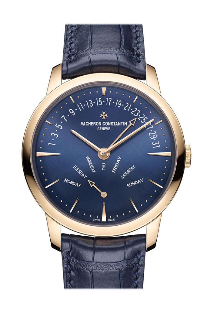 Vacheron Constantin Patrimony Retrograde Day-Date Automatic Blue Dial Men’s Watch 4000U/000R-B516Ā 18k 5n pink gold case with a dark blue alligator leather strap. Fixed pink gold 18k 5n pink gold bezel. Blue dial with rose gold-tone hands and index hour markers. Minute markers around the outer rim. Dial Type: Analog. Retrograde hand-type date and day of week. Vacheron Constantin Calibre 2460 R31R7/2 automatic movement with a 40-hour power reserve. Scratch resistant sapphire crystal. Pull / push crown. Transparent case back. Round case shape, case size: 42.5 mm, case thickness: 9.70 mm. Deployant clasp. Water resistant at 30 meters / 100 feet. Functions: retrograde, date, day, hour, minute. Luxury watch style. Watch label: Swiss Made. Vacheron Constantin Patrimony Retrograde Day-Date Automatic Blue Dial Men’s Watch 4000U/000R-B516Ā Ā 4000U000R-B516
